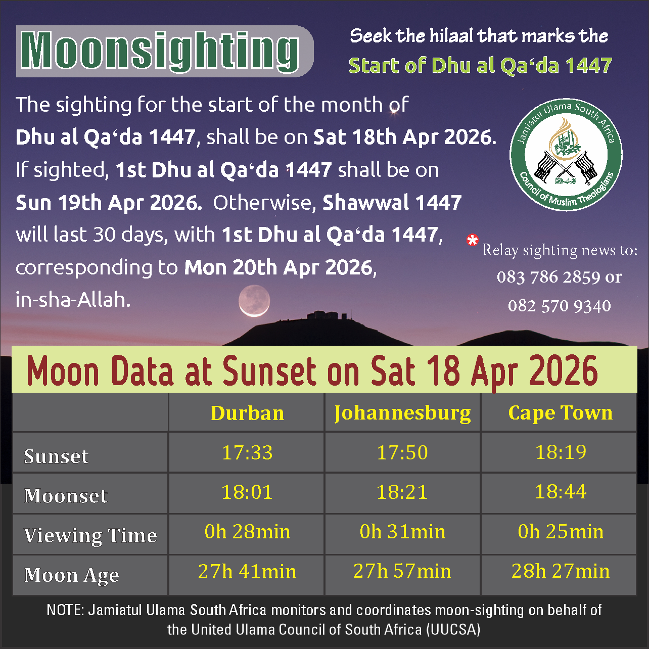 Below schedule shows data for the sighting of the crescent in Durban, Johannesburg and Cape Town.