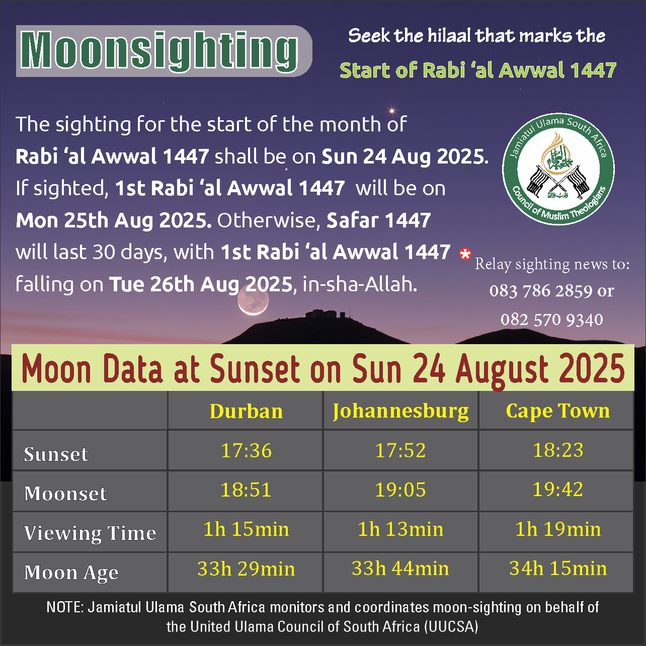 UUCSA will announce the official results of moon-sighting after confirmation procedures have been completed during Sunday evening, in-sha-Allah.